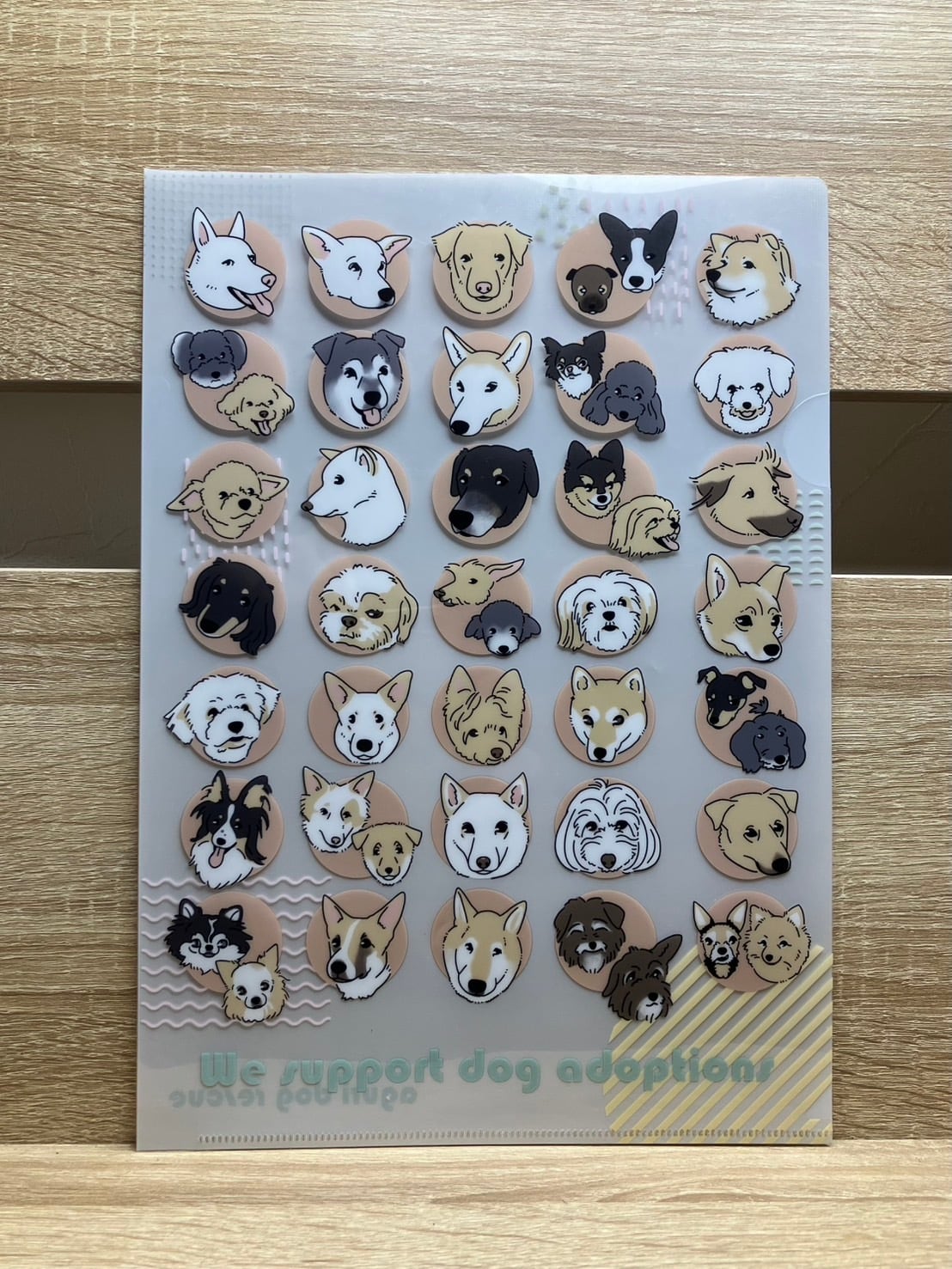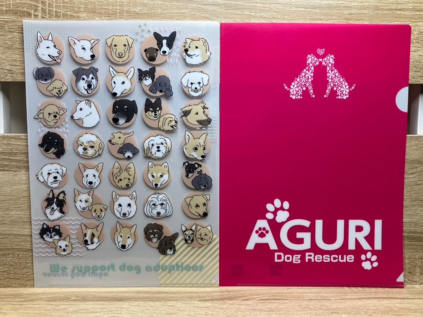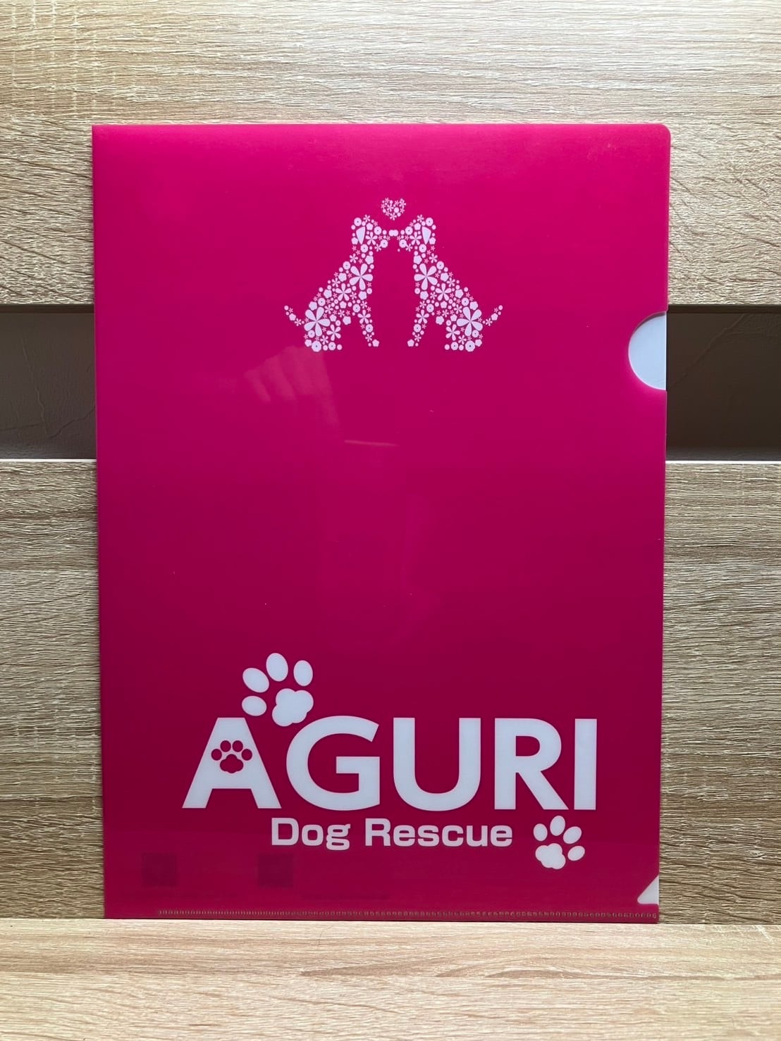 オリジナルクリアファイル アグリを象徴するピンクと、個性的な保護犬たちをデザインしました。オフィスや学校での使用にぴったりです。透明な素材を使用しているため、中に入れた書類やアートをしっかりと保護し、視覚的にも楽しむことができます。軽量で持ち運びも楽々なので、外出先でも思い出の写真や大切なドキュメントをスマートに管理できます。