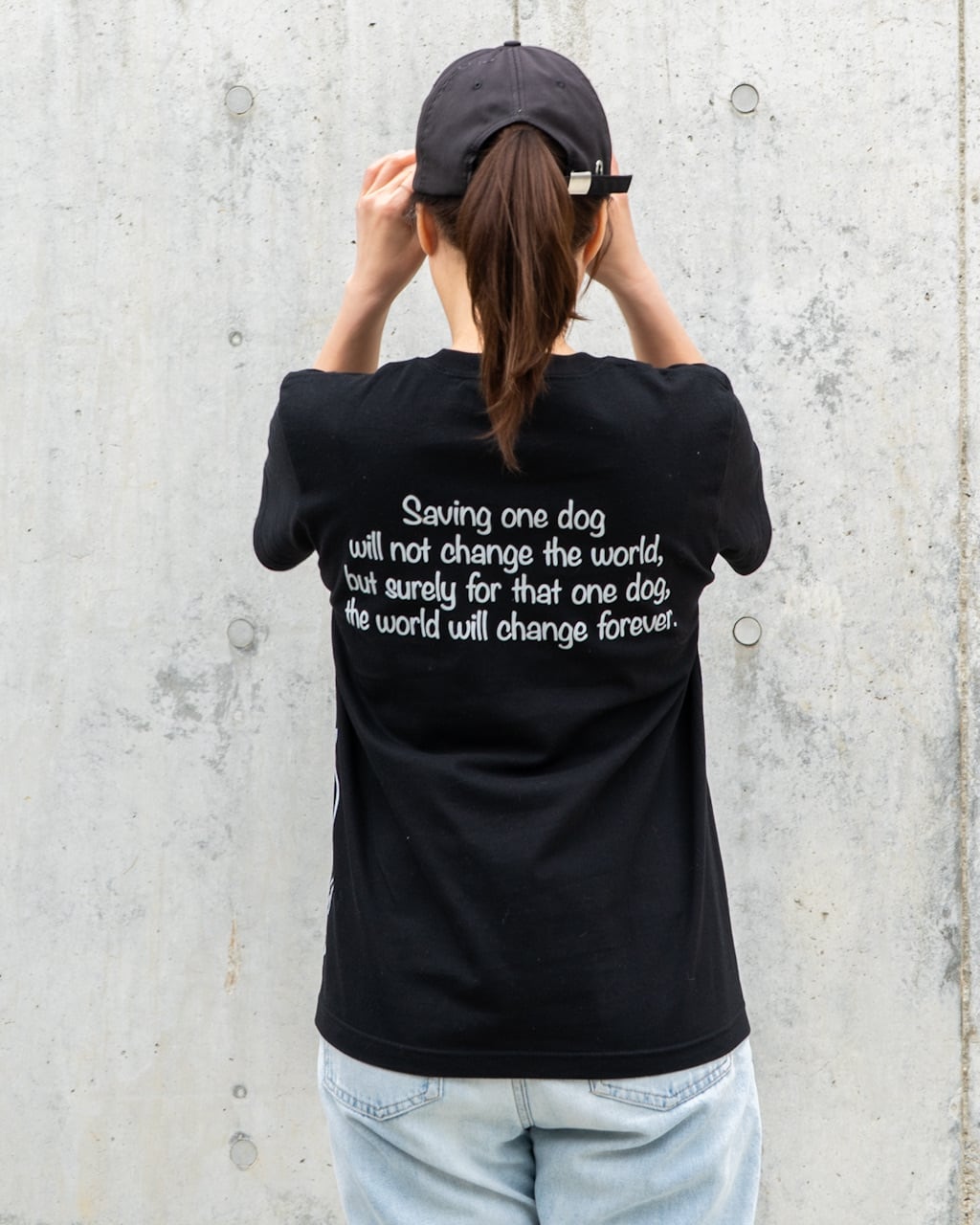 サイドには愛らしいワンコを、バックプリントには熱いメッセージを載せました。