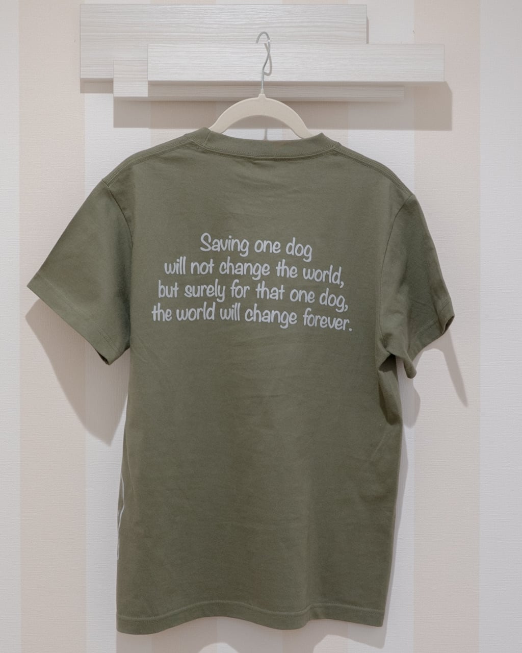 サイドには愛らしいワンコを、バックプリントには熱いメッセージを載せました。